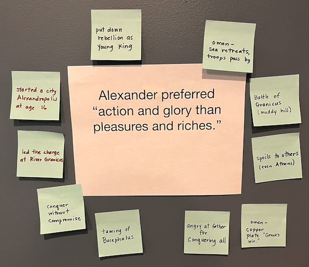 For the day of the exam, I had re-written the anecdotes from their compiled list onto sticky notes and stuck them up on a wall. Working in small groups, their task was to choose the anecdotes that best matched a given character trait and demonstrated how Plutarch supported that idea. For example, one group had the statement that Alexander preferred “action and glory than pleasures and riches.” To support that claim, they chose stories from his life such as his founding a city at age 16 and his displeasure at his father’s conquering “all” and leaving little scope for Alexander.